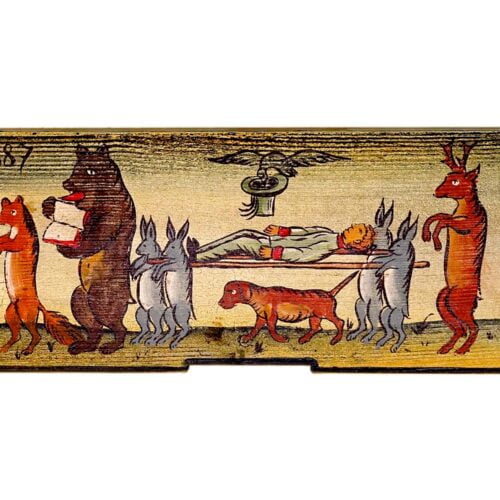 The painted beehive panels that flourish on the front of the beehives are part of Slovenian folk history and a story about the originality and rich imagination of their creators. The years from 1820 to 1880 are considered to be the golden age of panels, but after the Second World War, this extremely beautiful and simple folk craft slowly died out. Through the rich collection of various motifs on the beehive panels, we can get to know priceless stories, fairy tales and tales from the past. Each one told a story with its details: mostly about everyday farm life, folk craft products and animals. Saints and other religious motifs often appeared on them. The motifs of historical and war events and all other memories of that time are also priceless. Motifs that make fun of professions bring us, even today (centuries after their creation) a smile and enthusiasm for the originality and ingenuity of a simple person.
